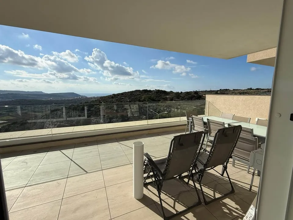 Situated on the third floor, this stylish property features a bright open-plan kitchen, living, and dining area, fully fitted with high-end appliances, a wine cooler, an electric fireplace, and all modern comforts. The dining area opens onto a spacious front terrace boasting breathtaking 180-degree valley and sea views, making it ideal for entertaining family and friends.